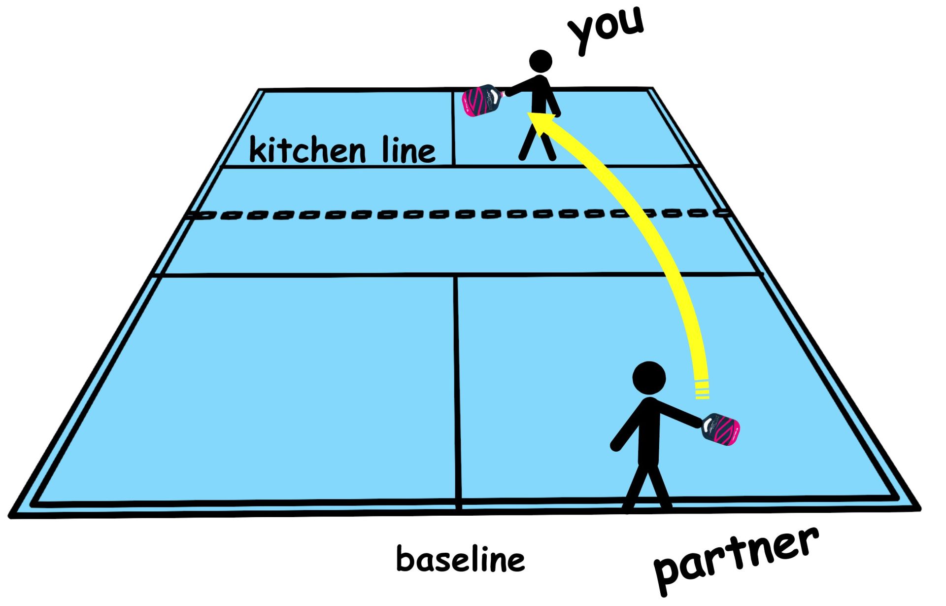 I’ve got a couple of drills for this. The first one is called “Don’t Panic.” Here’s how it works: you stand at the kitchen line, while your partner is at the baseline and drives the ball at you as hard as possible (Figure 1). Your goal is not to react until the ball is halfway to you. The reason for this is that many players tend to panic, tense up, and guess where the ball will go before it actually arrives. This drill helps you delay your reaction, so you’re seeing where the ball goes before you react, rather than guessing.