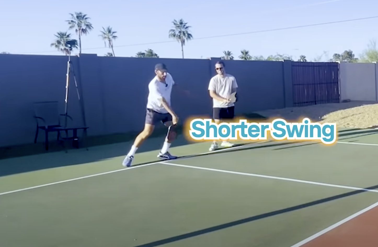 In pickleball, you should be taking shorter swings, not bigger ones. But a lot of times, we’re at the kitchen line, someone hits a hard ball, and we just take this huge swing. Pickleball is so fun, it’s tempting to hit the ball as hard as possible, but those big swings lead to errors.
