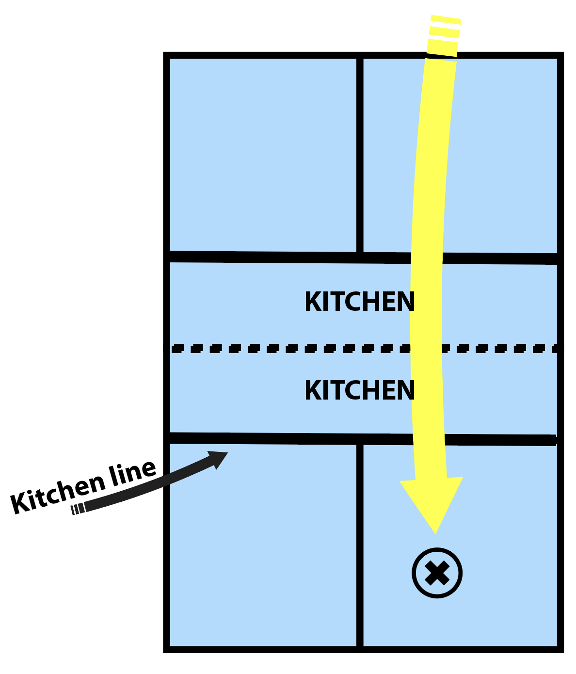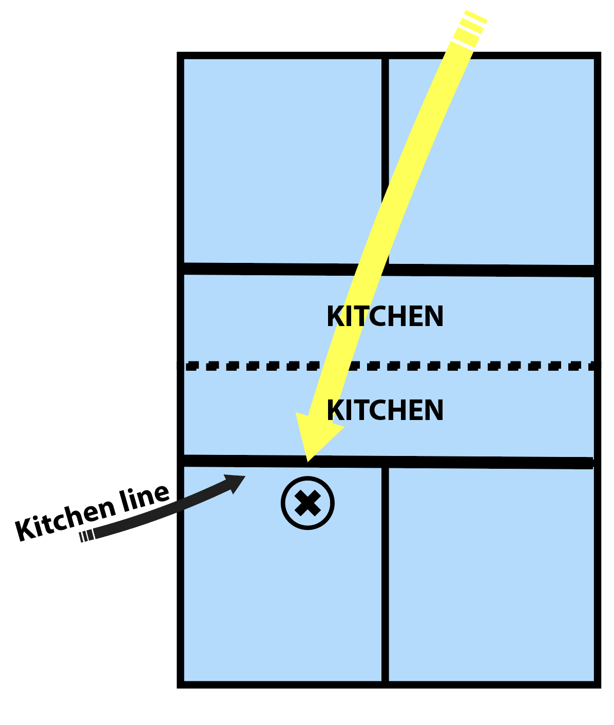 Shot number one is called the serve. The serve has to go across the court. If I hit the serve down the same side, that does not count. If it either hits the opposite kitchen line or lands inside the opposite kitchen line, that would not count. The serve must land beyond the opposite kitchen line on the opposite side.