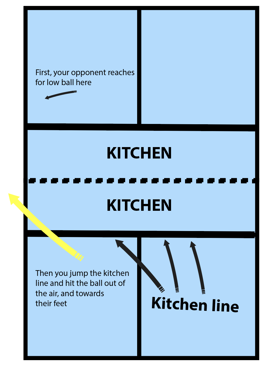 The seventh shot is called the Ernie, named after a man named Ernie. It’s also a next-level shot. The trigger to go Ernie is when your opponent is off balance and has their head down. This allows you to jump the kitchen line and take the shot down the line. It’s a satisfying move when done correctly.