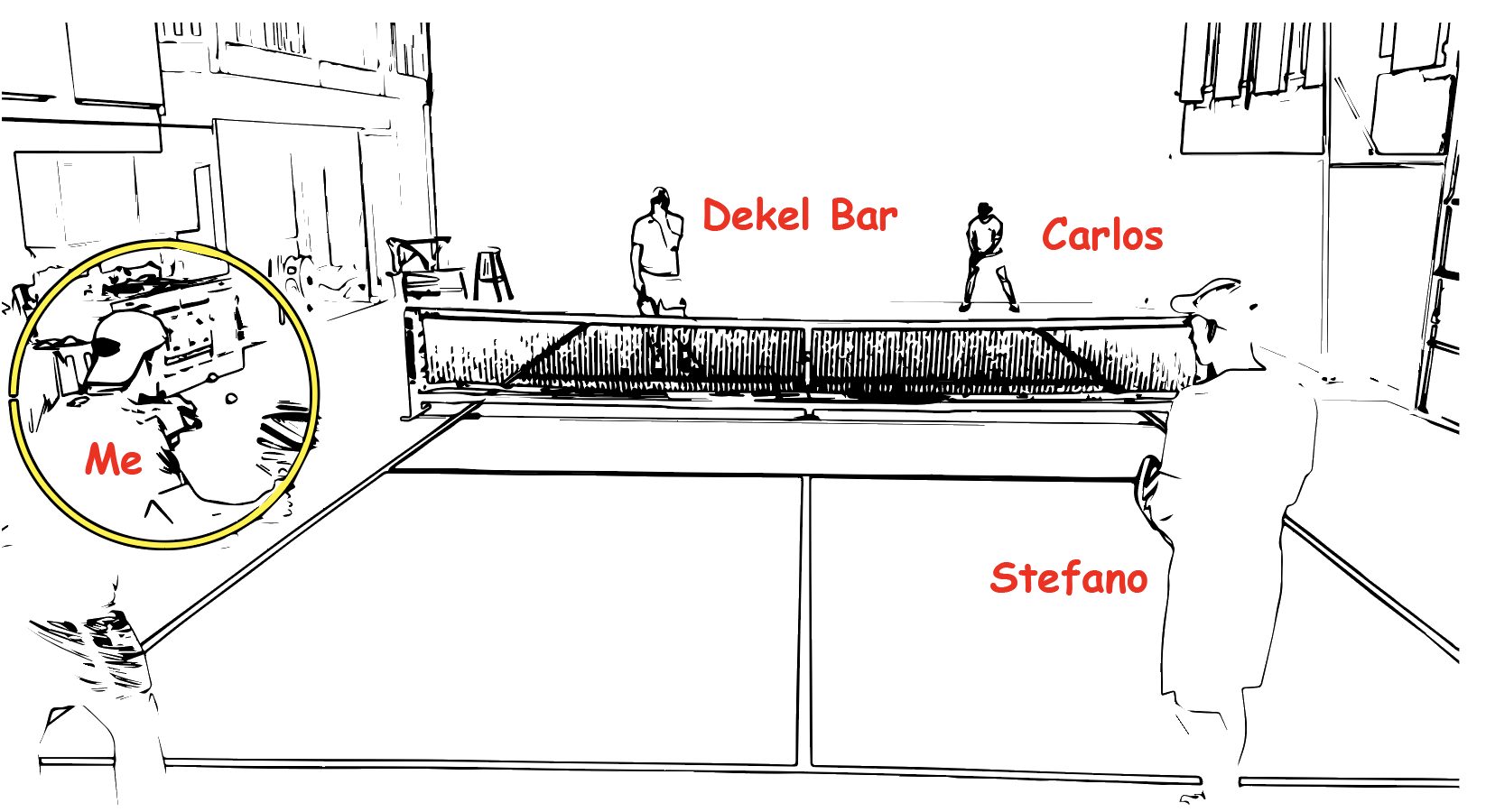 - I drive to Dekel, who volleys, but Stefano is right there to intercept it with his forehand.