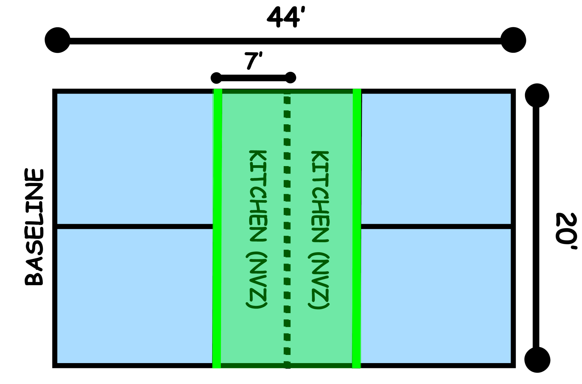 If you hit a shot that might be attackable (like a “dead dink” that sits up in front of them), take one big step away from the kitchen line after you hit it. (see figure 1 if you need to remind yourself of where the kitchen line is). That single step gives you roughly 30% more reaction time. That’s huge. It might be the difference between getting jammed and being able to read and counter their attack.