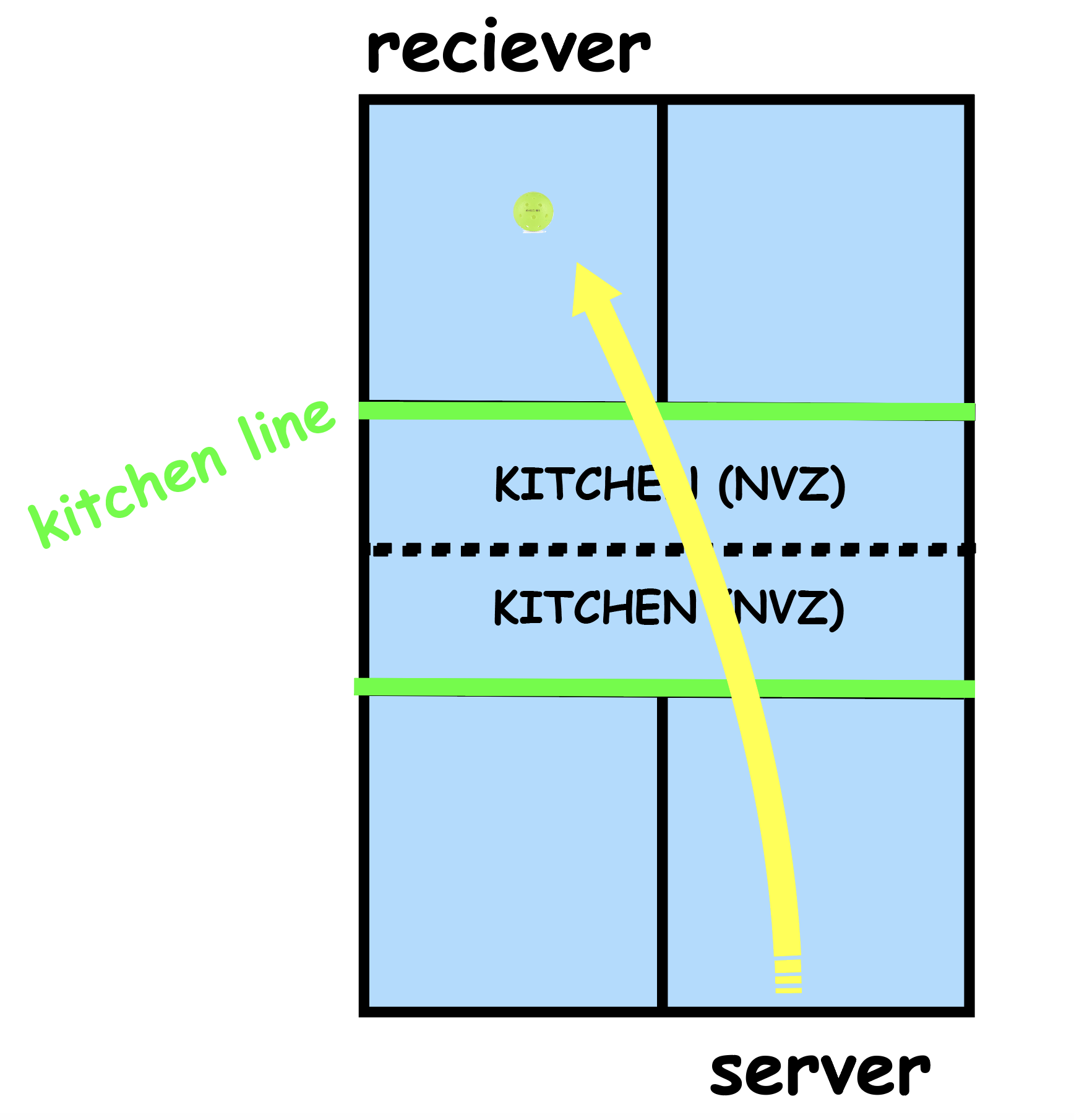 Also, the ball must land beyond the kitchen line. If it lands on the kitchen line, it’s a fault. If it hits any other line beyond the kitchen, you’re good.