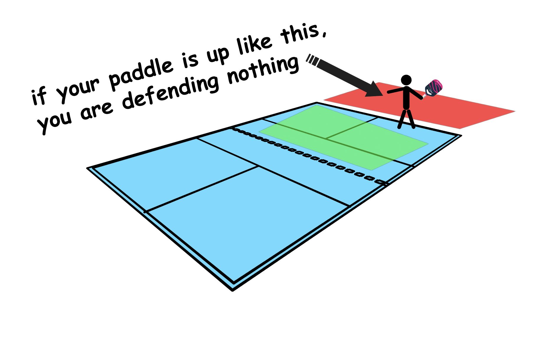 Your paddle should be down, ready to respond. When you see someone about to crush an overhead at you, start moving back and keep your paddle low. If an opponent has an overhead and you think they’re going to smash it, you should move behind the baseline to give yourself some space.