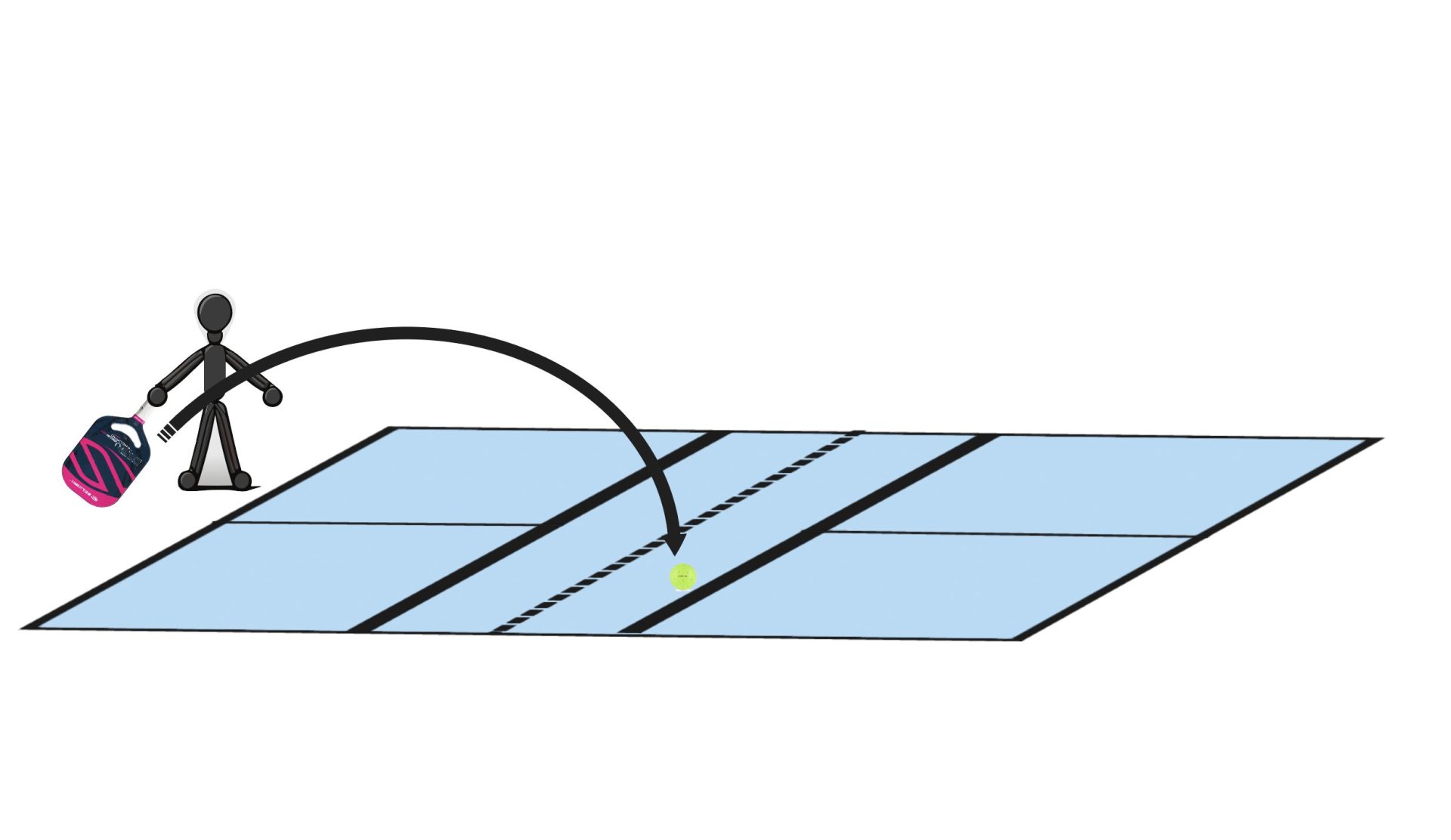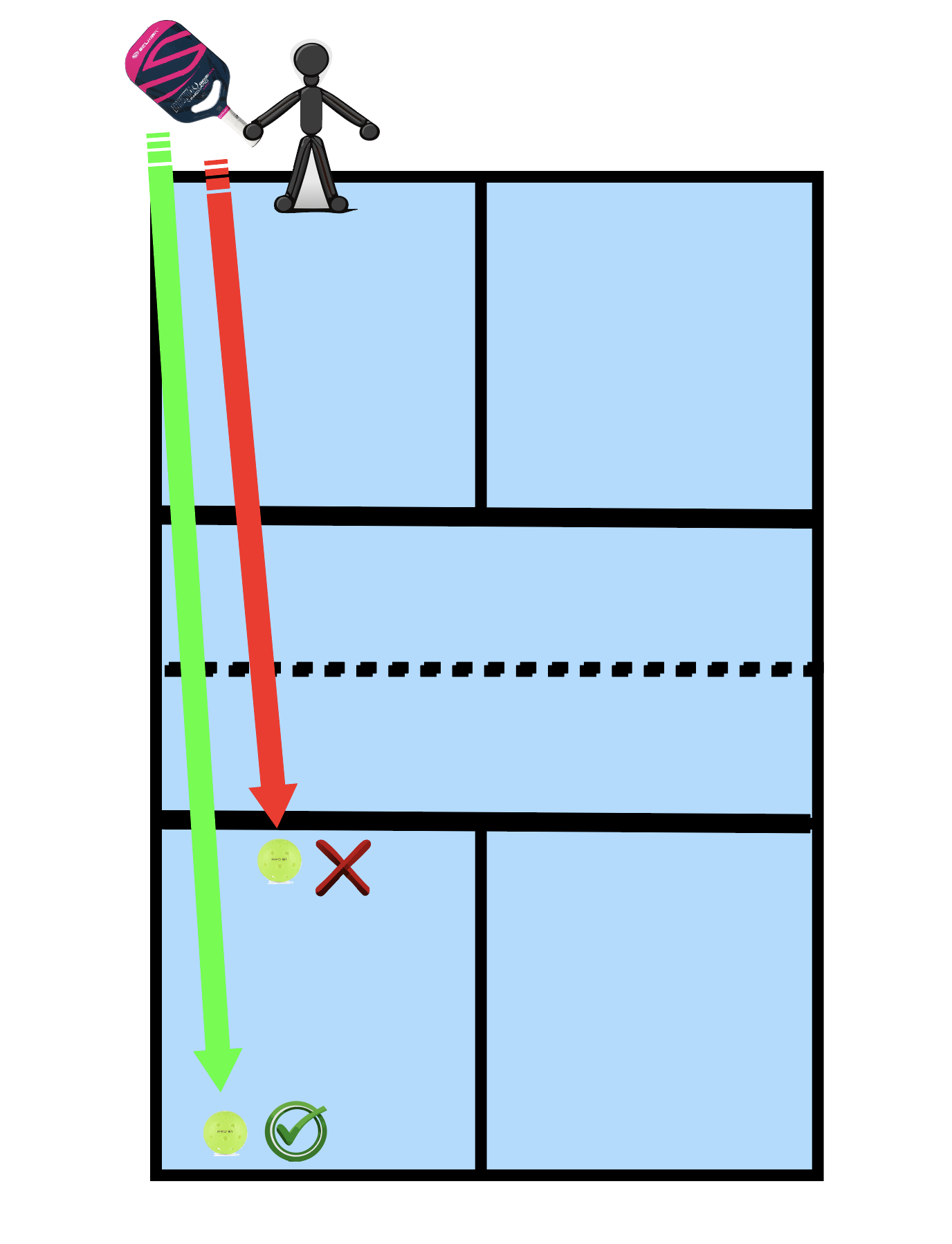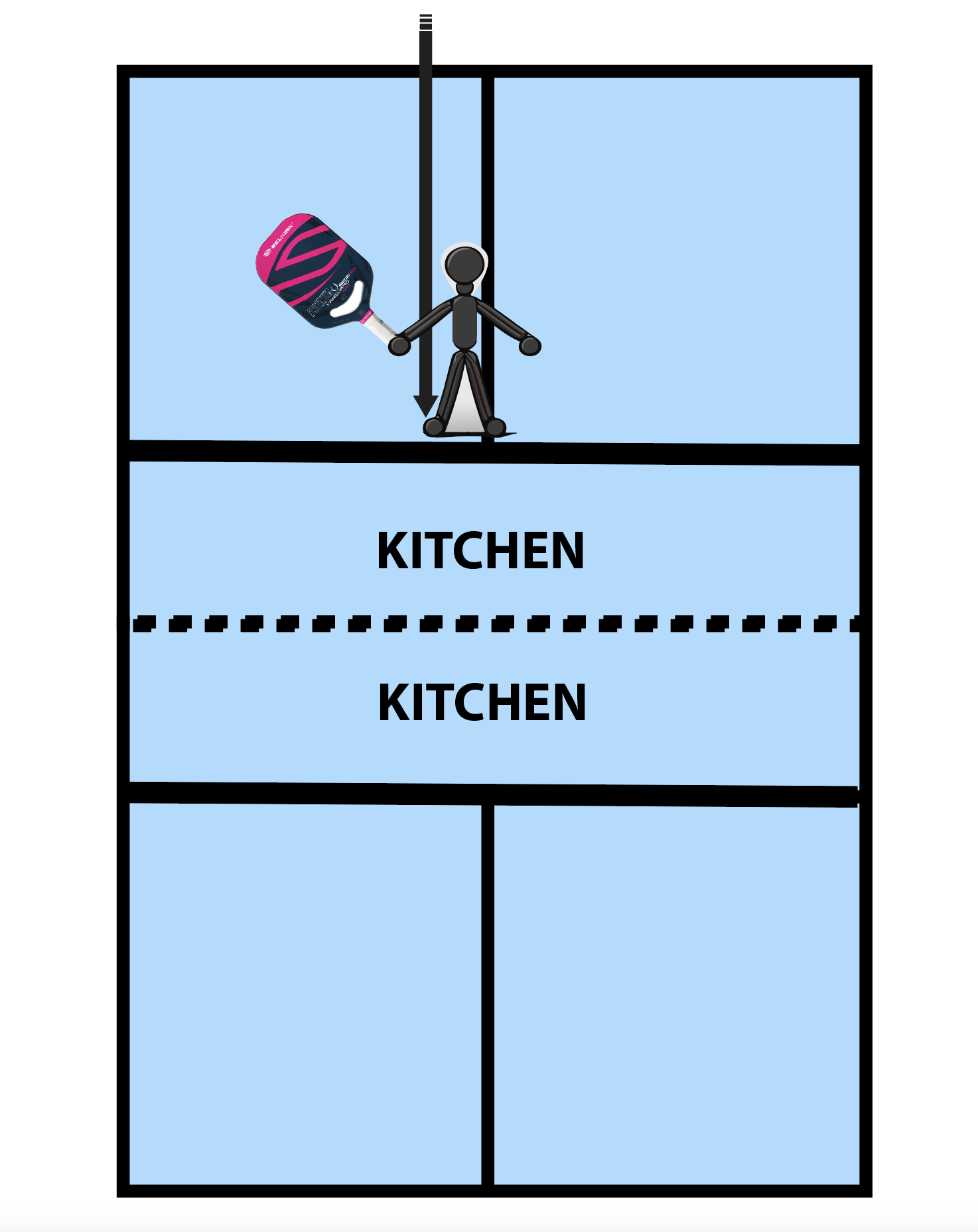 A common strategy in doubles, the third shot drop, is also effective in singles. After serving and receiving the return, hit a third shot drop to your opponent’s backhand. If you hit it soft enough and in a way that’s not too high, they can’t just run around and pound it. Try to land the ball in the kitchen (Figure 4). This slows the game down and gives you a chance to regain your offense.