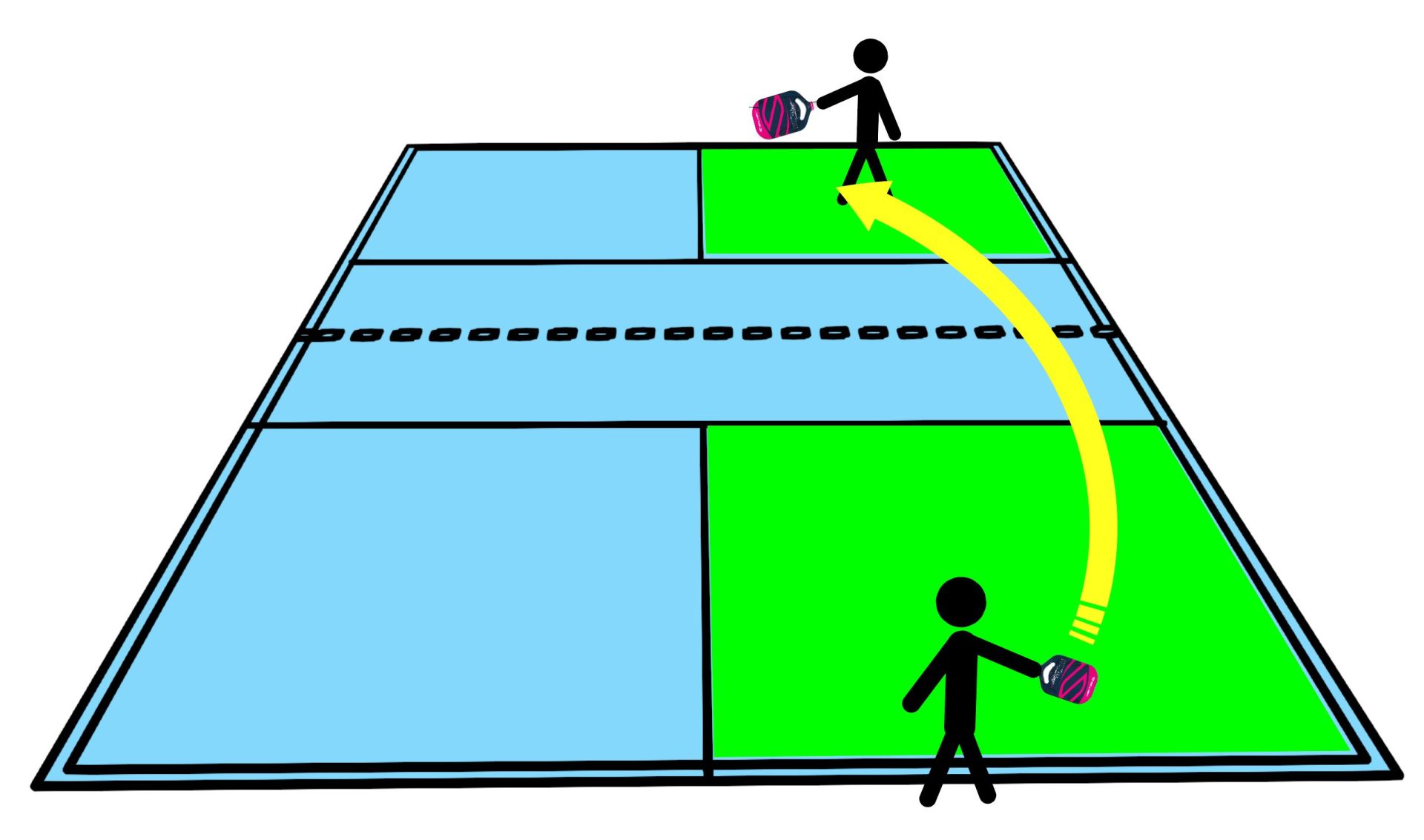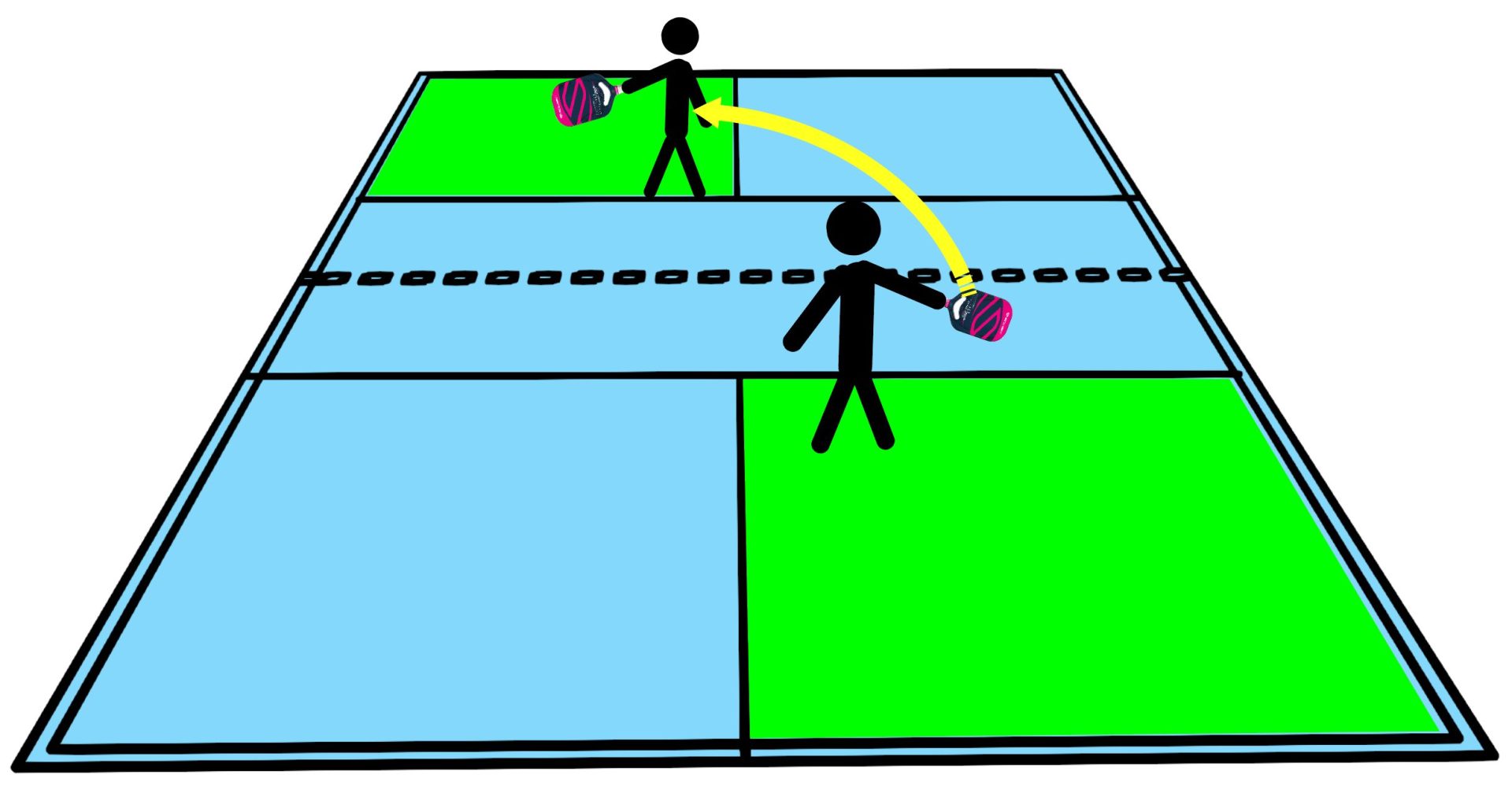 Why is it for doubles? Because you’re only going to play on the “skinny” part of the court, meaning just the cross-court section on your side and on your opponent’s side (Figure 1). You’ll practice both cross-court and down-the-line shots, which helps for doubles positioning and accuracy.