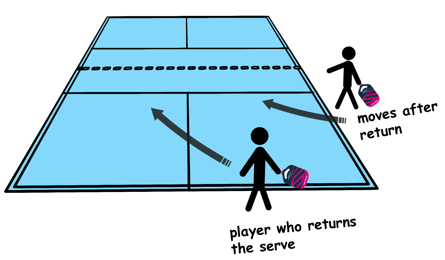 This switch allows the returning player to cover the middle momentarily as their partner moves to their side of the court, reducing any gaps in coverage.
