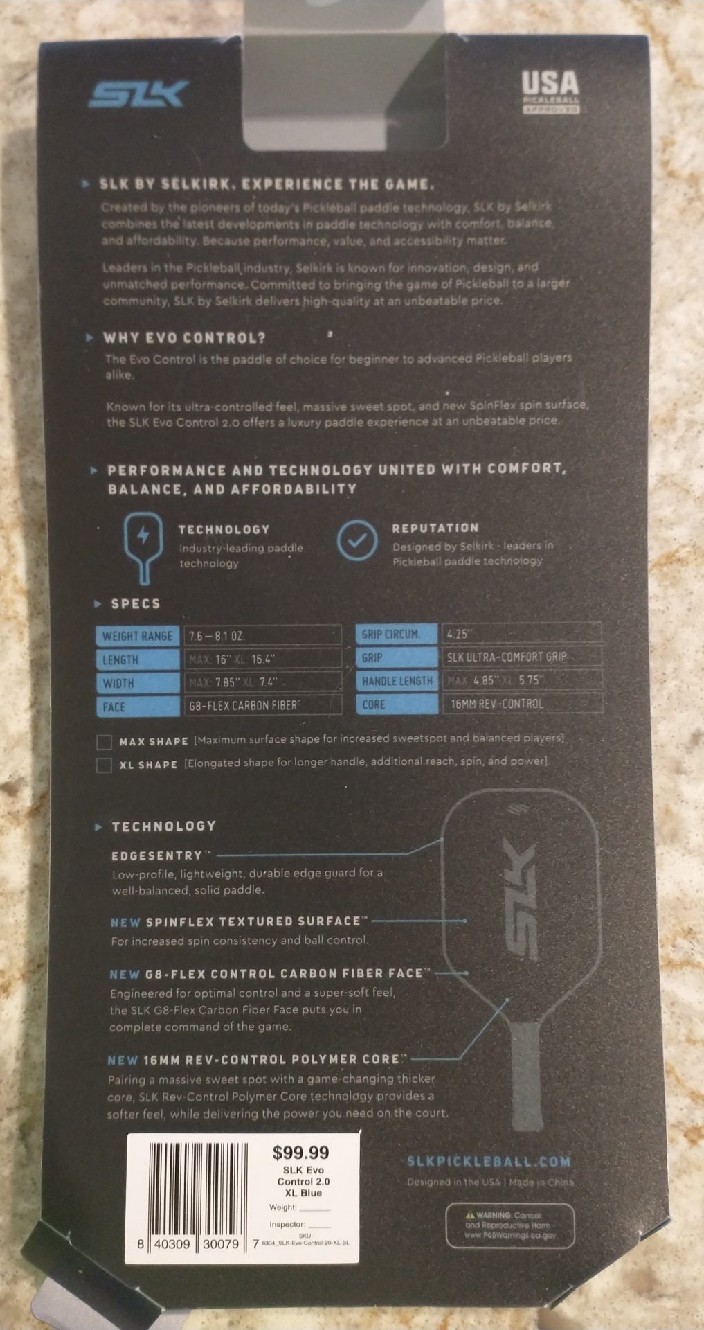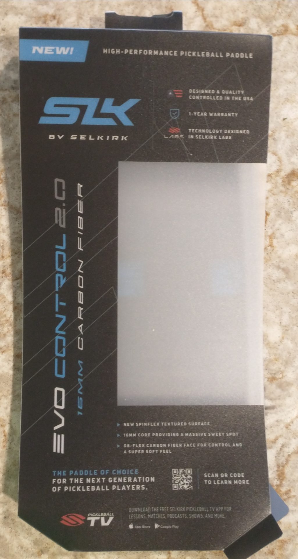 From the store shelf hung many paddles–different makes, different designs, different specifications, different enticements. I held each of them in my hand, trying to “feel” them: how they fit in my palm, how the handle felt, the weight of the paddle, the ease of movement (and swing) from different paddle positions, so on and so forth. Any other details were unimportant–except for paddle face and color. This may sound silly, but I wanted a design that fit my personality a little. Because I liked the colors and the handle, I chose the Selkirk, an EVO Control 2.0 16MM Carbon Fiber XL Blue. The price being more than I was prepared to spend, a hundred dollars, I shopped around and found a new one on Ebay for $30.00 off, a sizable discount.
