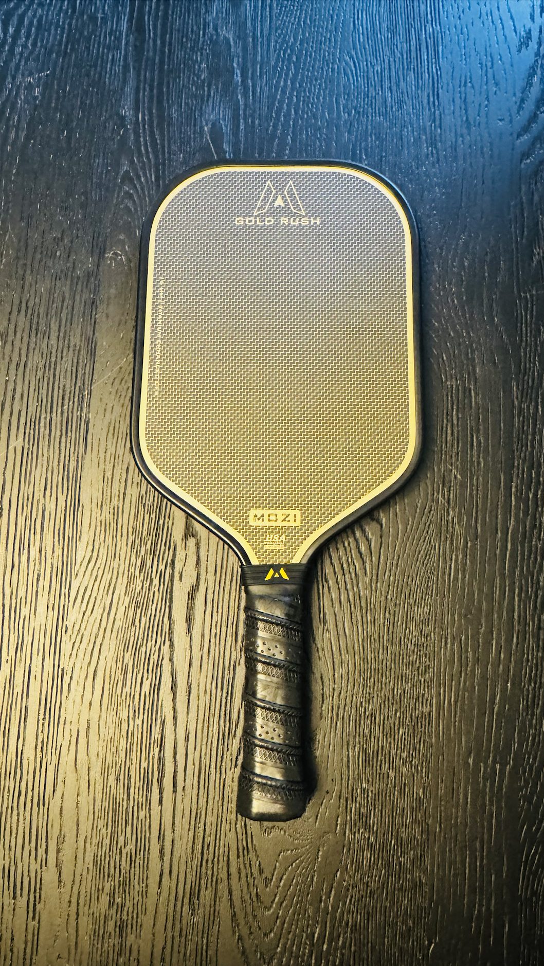 The Gold Rush is the top of the line paddle from Mozi. It features an innovative face material: titanium infused carbon fiber. It is a thermoformed paddle with a hybrid shape and shares many features of other paddles of the same shape and build. The balance, core, sweet spot, grip and overall feel are generally disappointing. Unless the titanium surface is something you really want, I would look to other paddles for better play at a lower price.